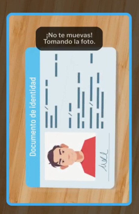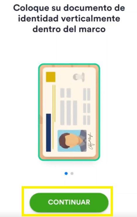 - Coloca el documento de identidad como se indica en la pantalla de tu dispositivo. Es importante que estés en un área bien iluminada para facilitar el proceso. Cuando esta sea aceptada, haz clic en “Continuar”.