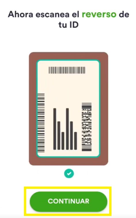 - Muestra el reverso de tu identificación, posiciónala como se indica en tu dispositivo y permite que el sistema la escanee. Es importante que estés en un área bien iluminada para facilitar el proceso. Cuando esta sea aceptada, haz clic en “Continuar”.