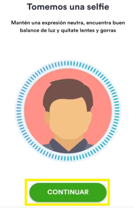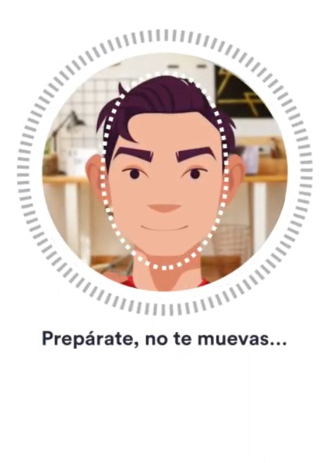 - Utiliza la cámara de tu dispositivo para tomarte una fotografía tipo selfie o autorretrato. Es importante no utilizar accesorios como gorras o lentes. Haz clic en “Continuar” y coloca tu cara dentro del óvalo que muestra el sistema.